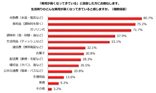 2.費用が上がっているもの、1位「光熱費」80.7%、2位「食料品」75.2%