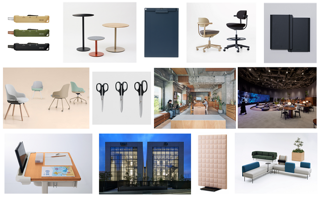 (写真1段目左から)「2Way携帯ハサミ<ハコアケ>」、オフィスラウンジテーブル「C-Table(シーテーブル)」、「クリップボード(薄型・静音クリップ)」、チェアー「pallo(パロ)」、ドイツ装ノート「PERPANEP(ペルパネプ)」、(2段目左から)カジュアルチェアー「Liite(リーテ)」、「高級ハサミ<HASA(ハサ)>」、サテライト型の社員向け多目的スペース「n.5(エヌテンゴ)」、オープンコミュニケーションホール 「THE CAMPUS HALL "CORE"(ザ・キャンパス ホール"コア")」、(3段目左から)学校机用アタッチメント「つくえ+(つくえたす)」、「FUJIFILM Creative Village」、吸音パネル「fore moving panel(フォーレ ムービングパネル)」、可変型ソファー「OSFA(オスファ)」