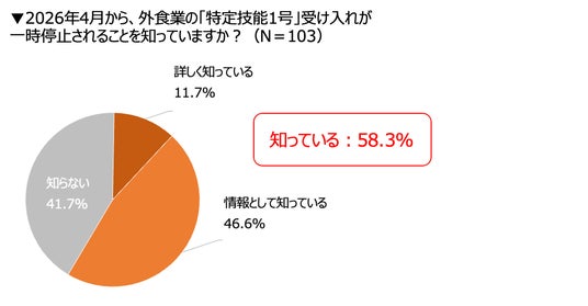 2026年4月からの外食業での特定技能1号の受け入れ一時停止について、認知している飲食店は58.3%