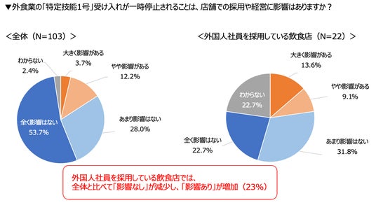 外国人社員を採用している飲食店に限定すると、「全く影響はない」は22.7%に減少し、「やや影響がある」(9.1%)と「大きく影響がある」(13.6%)を合わせた「影響あり」は22.7%となり、全体と比べて「影響なし」が減少し、「影響あり」が増加しました。