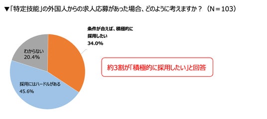 「特定技能」の外国人からの応募に対し、34%が「条件が合えば積極的に採用したい」と回答