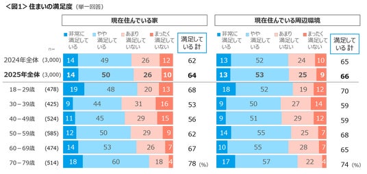 現在住んでいる家に対しては、非常に+やや満足しているは64%、周辺環境は66%。家と周辺環境ともに30~40代は5割台にとどまり、70代は7割を超える。<図1>