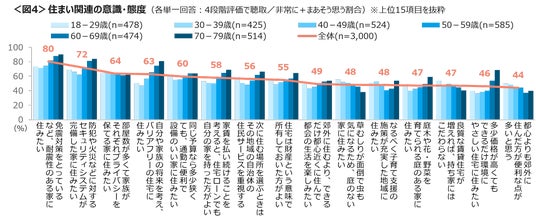 「免震対策をとっているなど、耐震性のある家に住みたい」は80%、「防犯や火災などに対するセキュリティシステムが完備した家に住みたい」72%がTOP2。次いで「部屋数が多くて家族がそれぞれプライバシーを保てる家に住みたい」「自分や家族の将来を考え、バリアフリーの住宅に住みたい」「同じ予算なら多少狭くても、通勤に便利で設備のいい家に住みたい」が6割台。多くの項目は年代が高くなるほど割合は増えるが、「草むしりが面倒で虫も気になるため、庭のない家に住みたい」「良質な賃貸住宅が増えれば、持ち家にはこだわらない」のみ年代が若いほど高い。<図4>