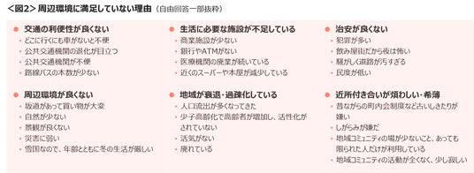 周辺環境への不満は、交通の利便性や治安が良くない、生活に必要な施設が不足している、地域が衰退・過疎化している、近所付き合いが煩わしい・希薄という声があがった。<図2>