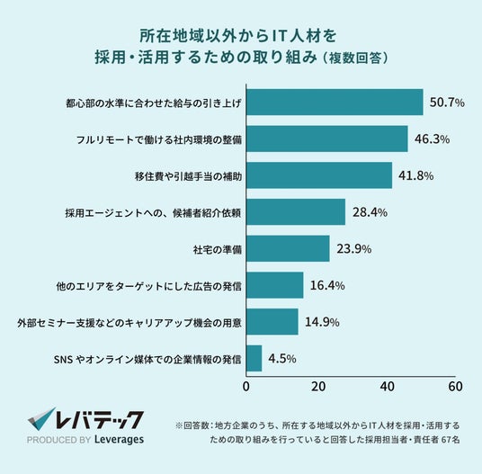- 地域外からの人材獲得に向けた取り組み、「都心部の水準に合わせた給与の引き上げ」が最多