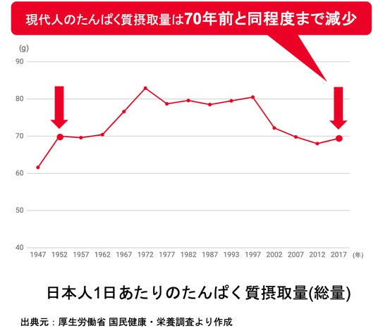 ※近年になって過度のダイエットや偏食傾向の影響で、たんぱく質の摂取量は減少し、1950年と同水準まで落ち込んでいます。