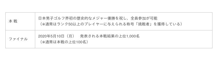 GW期間中に開催する今回は、日本男子ゴルフ界初の歴史的なメジャー優勝を祝し、MGC本戦へは全員が参加可能なだけでなく、MGC本戦の上位100名が進出することができるMGCファイナルの出場枠を通常の10倍の1,000名に拡大して開催いたします。