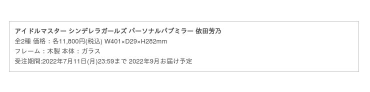 株式会社バンダイナムコアミューズメントは、『アイドルマスター シンデレラガールズ パーソナルパブミラー 依田芳乃』を6月16日(木)に発売します。「依田芳乃」は、「アイドルマスター シンデレラガールズ」に登場するアイドルの一人。7月3日生まれ、身長151cm。趣味は悩み事解決・石ころ集め・失せ物探しという鹿児島県出身の16歳です。同日より株式会社バンダイナムコエンターテインメントが運営するECサイト、「アソビストア」にて期間限定の受注販売を開始します。