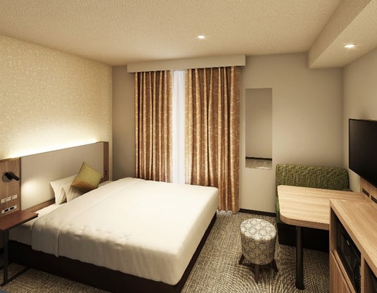 漆喰をイメージしたクロスを採用した客室パース画像(スタンダードダブル)