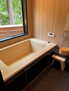 360度山に囲まれたマイナスイオンたっぷりのグランピング施設にあるグランピングドーム内に「雅月」をご採用いただきました。バスルームの窓からは付知川を臨むことができ、香り高い天然木の浴槽と大自然に囲まれた空間で至福の時間を過ごすことができます。