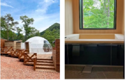 納入事例紹介:山に囲まれたグランピング施設や高級旅館の雰囲気を味わえるモデルハウスで夢のような空間を演出します