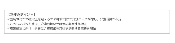こうした状況を受け当社は、研修を求める企業に対し、講師を派遣する事業を受託しました。当事業の推進により、介護施設における人材確保や、仕事と介護の両立支援に向けた企業ニーズなどに対応してまいります。