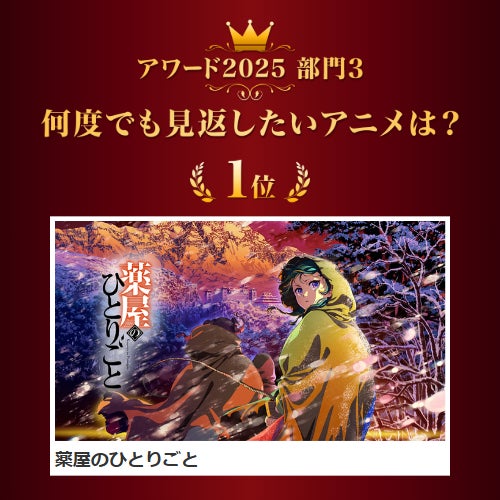 国内最大級(※1)の7,200作品以上のアニメが見放題(※2)の「dアニメストア」( https://animestore.docomo.ne.jp/ )では、昨年もたくさんの傑作アニメが配信されました。dアニメストアでは【2025年に1番○○だったアニメ】を決めるアンケートを2025年12月13日~2026年1月10日に実施。ユーザー3,700人以上の方にご回答いただき、8部門の受賞作品が決定いたしました!!