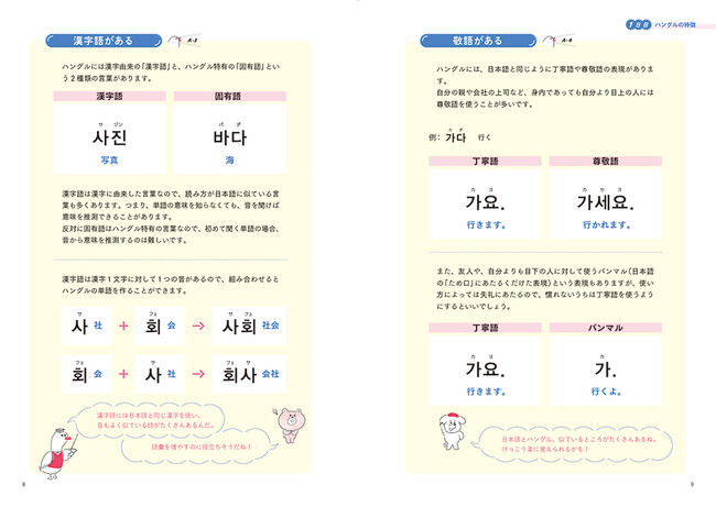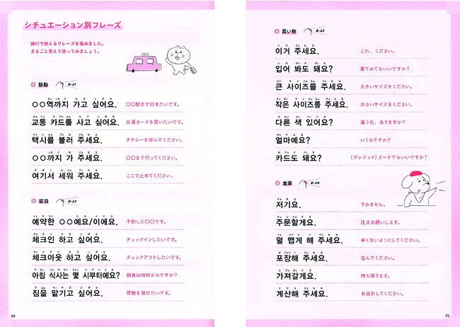 書き取りなどはなく、1日に2つのパートを読むだけ。ハードルが高いと思われがちなハングルが、図解ですらすら覚えれられます。付録には、旅先でも使える便利なフレーズも掲載しているので、まるごと覚えて現地で使えば、韓国旅行がもっと楽しくなりそうです!