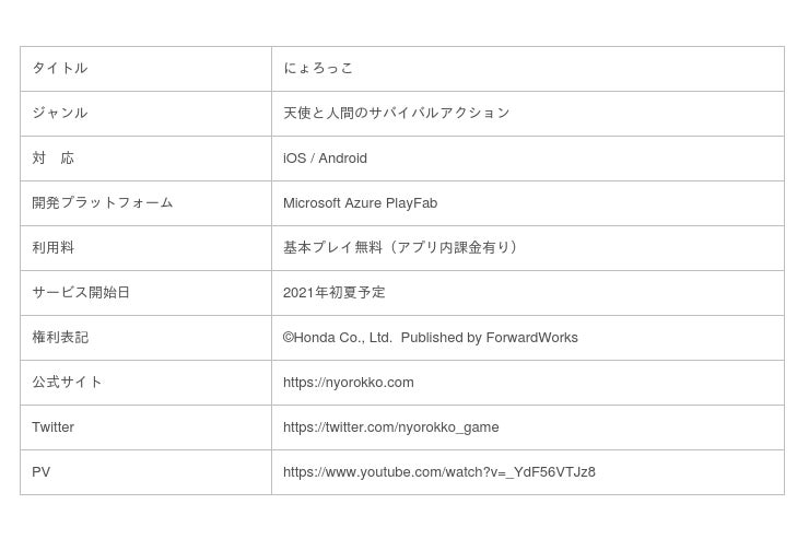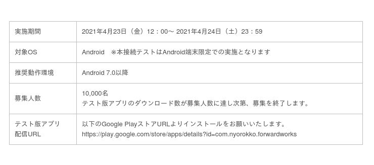 株式会社フォワードワークス(以下、FW)は、本田翼さん製作総指揮のスマートフォンゲーム向けゲームアプリ、にょろにょろ対戦ごっこ『にょろっこ』(2021年初夏サービス開始予定)のAndroid向け接続テストを実施することをお知らせいたします。