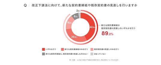 さらに、改正下請法の対象企業に対し、2026年1月の改正下請法施行に向けて、新たな契約書締結や既存契約書の見直しを行うかを聞いたところ、「いずれも行う」が42.8%、「新たな契約書締結のみを行う」が29.9%、「既存契約書の見直しのみを行う」が16.5%となりました。約9割が、改正に向けて新たな契約書の締結や既存契約書の見直しを予定していることが明らかになりました。変更された契約内容を、営業や調達といった実務担当者が正しく履行できる環境の整備が急務になっています。