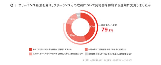 2024年11月に施行されたフリーランス新法では取引条件を書面で明示することが義務付けられています。フリーランスとの取引について、「すべての取引で契約書を締結する運用に変更した」と回答した方は43.6%、「一部の取引で契約書を締結する運用に変更した」と回答した方は35.5%で、約8割が契約書を締結するよう変更しています。