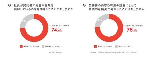 また、見聞きしたことがある人に対して、契約書の内容や有無の誤解による金銭的な損失についても聞いたところ、「発生したことがある」と答えた人は76.1%にのぼりました。