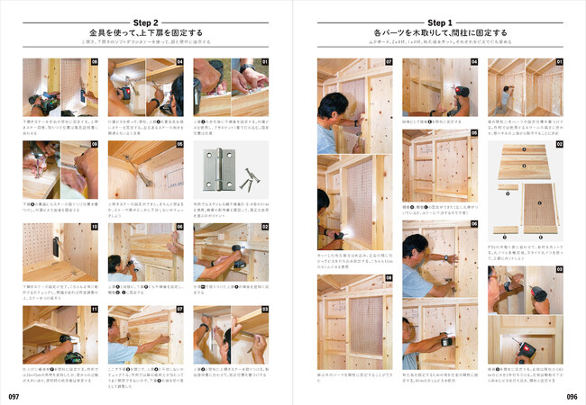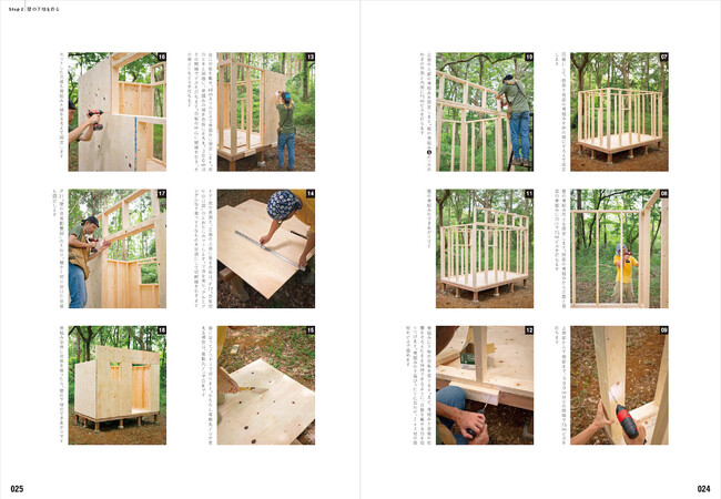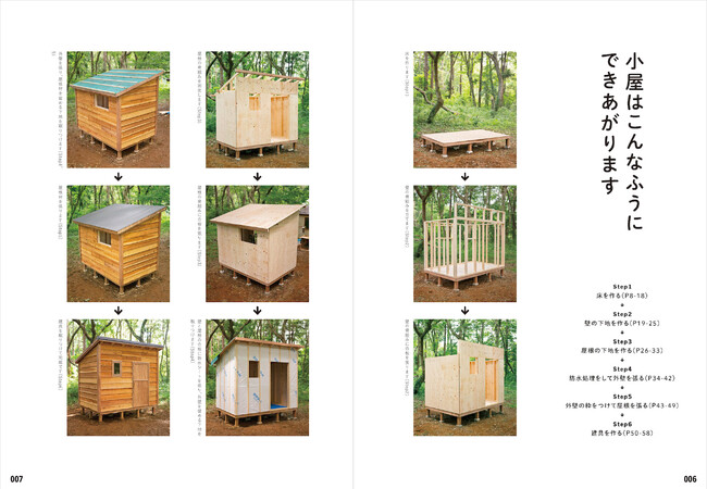 作りやすさにこだわった床面積およそ1.8×2.7m、2×4工法タイプの小屋をモデルケースとし、作業手順の一部始終をわかりやすい写真とともに解説しています。