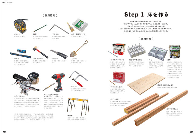 また、構造図はもちろん、材料の切り分け図など、作業の能率を大幅に高める実用的な図面を多数掲載していること、そして、使用材料と使用道具を作業工程ごとに紹介し、作業の進み具合に応じて効率よく段取りができるようにしていることもポイントです。