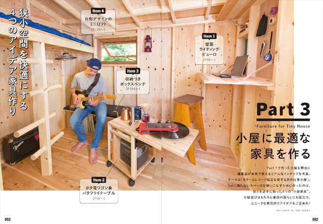 Part1で製作した小屋をモデルに、「壁面ライティングビューロ」「ポータブル電源収納ワゴンを兼ねた片側式バタフライテーブル」「収納つきボックスベンチ」「台形ミニロフト」といった4つの家具を製作し、その手順を詳しくリポート。小屋時間を楽しみ尽くせる空間作りの参考になるノウハウが見つかるはずです。