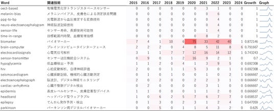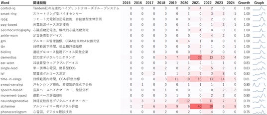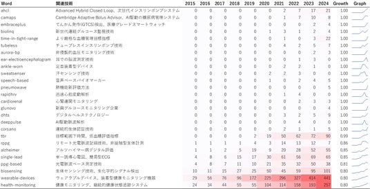 成長率上位には「心拍変動解析」、「連続血糖モニタリング」、「非侵襲的センシング技術」に関するキーワードが多く出現していることが読みとれます。その中からとくに注目のキーワードを紹介します。
