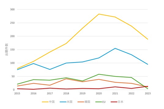 特許出願数では、中国でもっとも多くの特許が出願されており、つづいて米国、韓国、EU、日本の順となっています。
