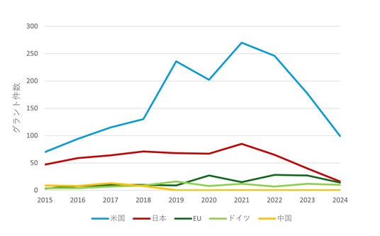 グラント件数では米国が最多ですが、日本も一定数が確認されました。賦与額では米国が圧倒的に多く、EUが増加傾向にあります。日本のグラント数については、内閣府の戦略的イノベーション創造プログラム(SIP)、科学技術振興機構(JST)の未来社会創造プログラム、日本医療研究開発機構(AMED)による支援が継続されていることが要因です。