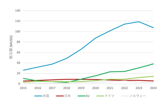 続いて、グラント(競争的研究資金)配賦額の動向分析です。企業や研究機関に賦与されるグラントは、特許や論文と比較して社会実装にさらに長い時間が必要な研究計画段階にある技術と関連する長期の様相が反映されます。