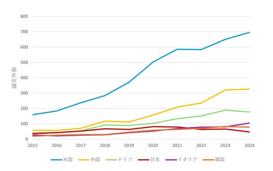 図4:デジタルバイオマーカーに関連する論文の国別出版件数の年次推移