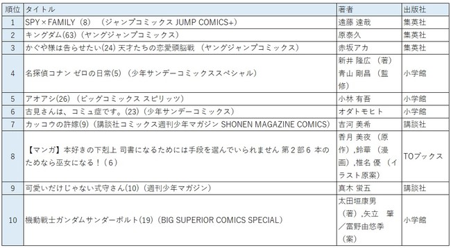第5位には「Jユース」(Jリーグクラブの下部組織)を舞台にしたサッカーコミック『アオアシ(26)』がランクインしました。本作は第65回 小学館漫画賞一般向け部門を受賞しています。