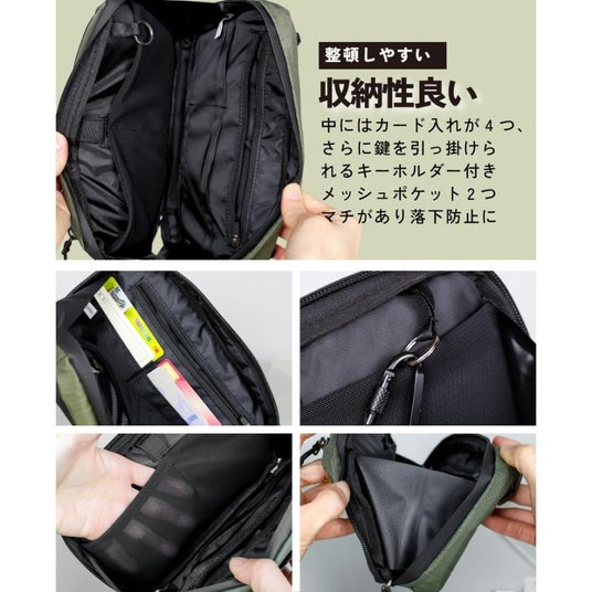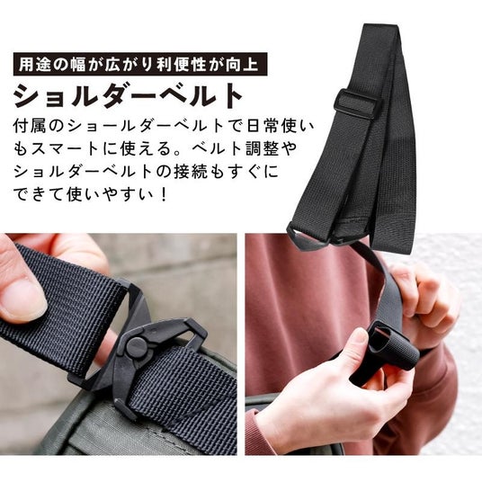 ベルクロベルトによる三点固定、内蔵式ベルクロベルト、撥水性表地・防水ファスナー、ハンドルバッグ&ショルダーポーチの2WAY