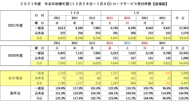 JAF(一般社団法人日本自動車連盟 会長 藤井一裕)は、年末年始期間(2021年12月29日~2022年1月4日まで)のロードサービス受付件数(速報値)をまとめました。