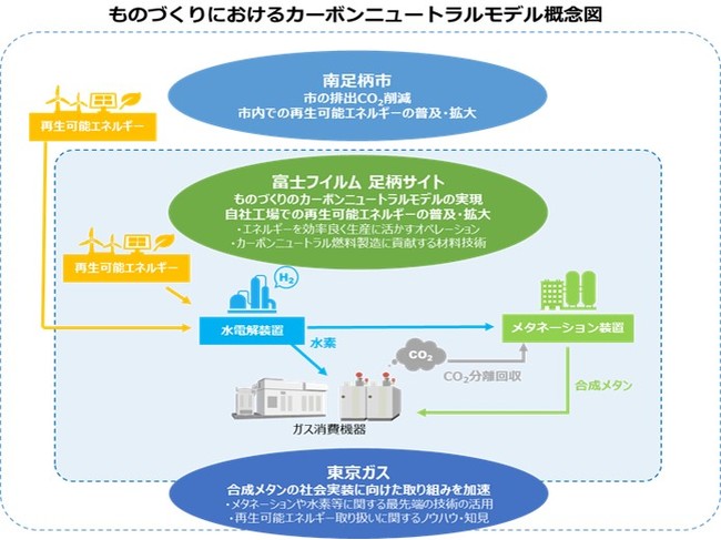 富士フイルム、東京ガス、南足柄市の三者は、これまで持続可能な社会の構築に欠かせない気候変動問題に積極的に取り組んできました。本協定は、2040年までに自社が使用するエネルギー起因のCO2排出を実質的にゼロにすることを目標に掲げ、環境負荷の少ない新たな生産活動を追求する富士フイルムと、メタネーション※や水素をはじめとする最先端の脱炭素化技術を保有する東京ガス、そして、カーボンニュートラルの実現に向け、市内のCO2削減を加速させる南足柄市の三者が協働し、ものづくりにおけるカーボンニュートラルモデルの確立を目指すものです。