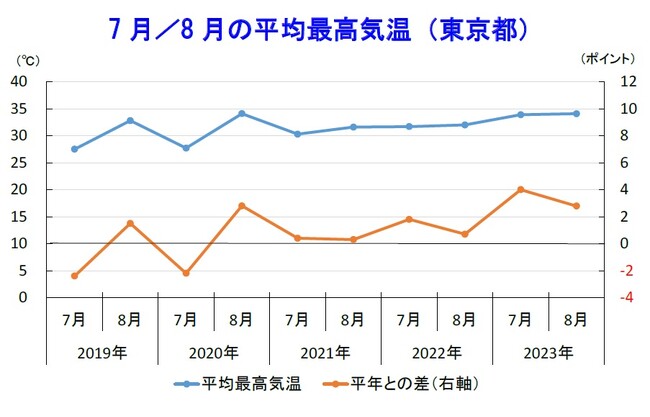 2023年の夏は、記録的な猛暑となっている。気象庁によると、東京都における2023年7月の最高気温は平均33.9℃で、平年値(1991年から2020年の30年間の平均値)より4.0℃高かった。さらに8月は同34.3℃と平年より3.0℃高くなると見込まれる(気象庁による8月25日7時発表の週間天気予報を含む)。また、東京都では7月と8月の猛暑日が合計24日におよび(同上)、都心における年間の猛暑日日数の最多記録を更新している。