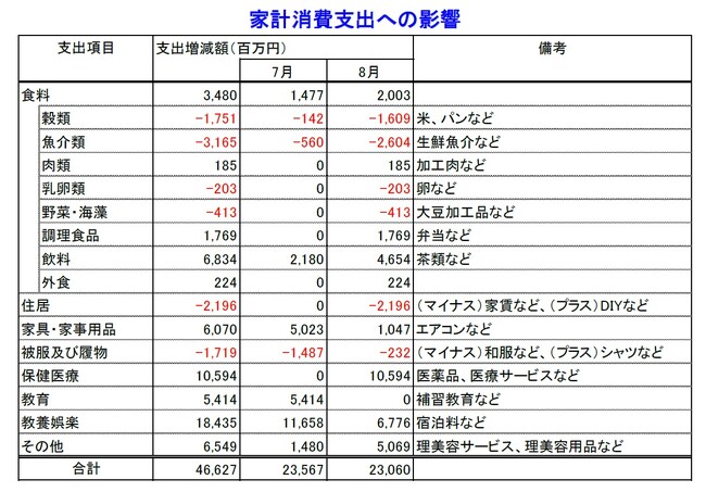 なお、世帯当たりの消費支出額では、7月に3,554円、8月に3,942円の増加が見込まれ、平均すると猛暑により今夏は月平均3,748円の支出増と試算される。