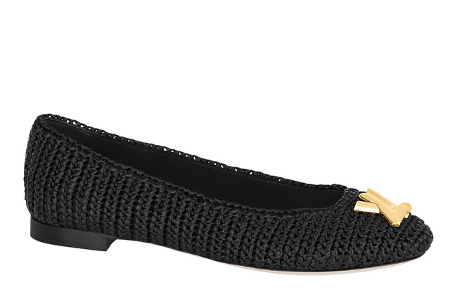 夏らしく、ラフィア(ヤシ)を卓越した職人技で仕立て、クラシカルなバレエシューズをルイ・ヴィトンならではの雰囲気で再解釈した1足は、ラウンドトウとフェミニンなローカットのフロント部分が特徴です。メゾンのアイコニックなバッグ「ツイスト」のロックから着想を得た、ゴールドカラーのLV イニシャルのアクセサリーが彩りを添えます。