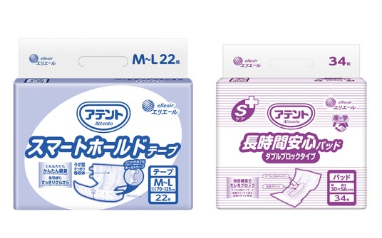 「アテント スマートホールドテープ」(左)「アテント Sケア 長時間安心パッド ダブルブロックタイプ」(右)