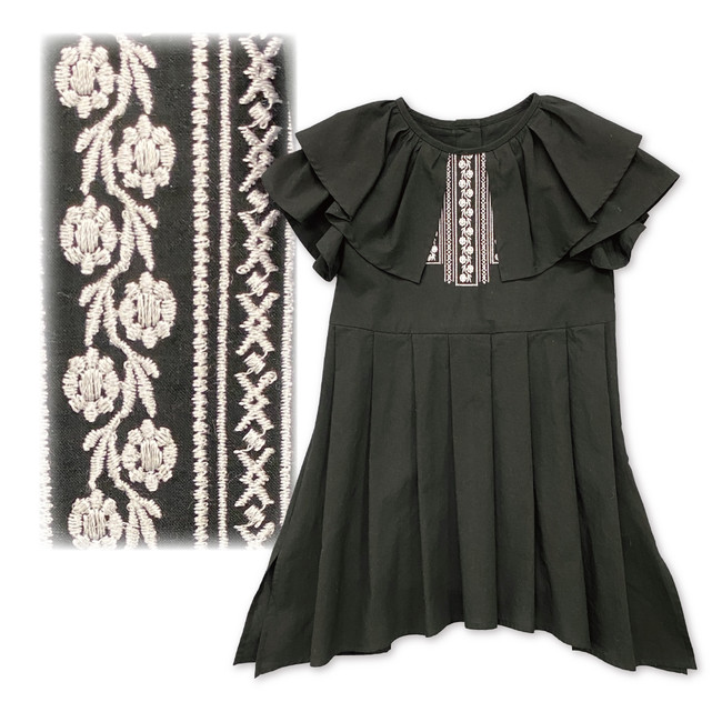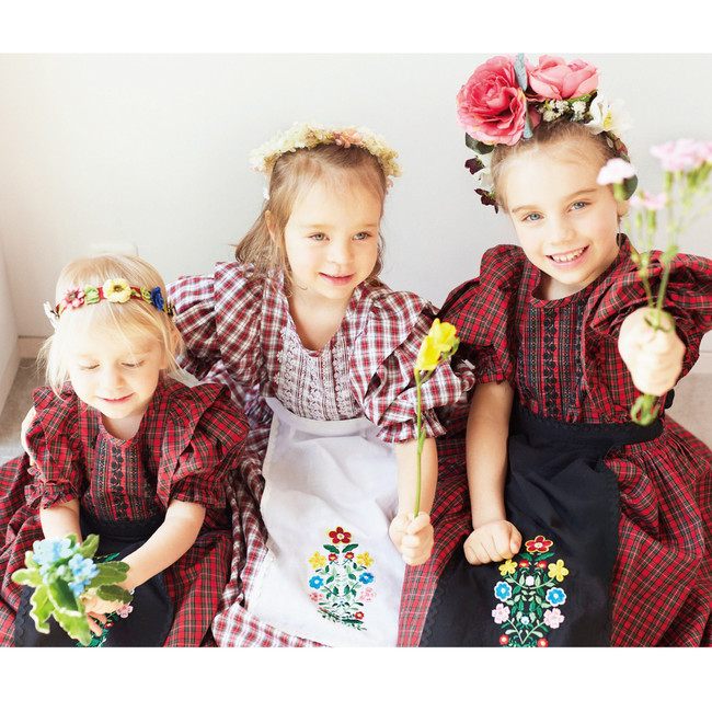 胸元とエプロンにそれぞれデザインの違う刺繍を施しました。胸元の刺繍は細かいお花をモチーフにしてリズミカルに繰り返しています。エプロンの刺繍は、大小のお花と葉っぱを組み合わせて、色使いをカラフルにすることで、明るく愛らしい刺繍に仕上げました。