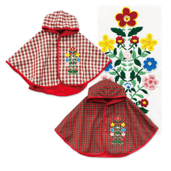 「エプロン付きドレス」のエプロンと同じ刺繍を、プルオーバーやマントに施しました。