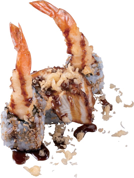 食べ応えある大えび天と人気ネタのひとつであるうなぎを味わえる、裏巻き寿司(ロール寿司)です。ぷりぷりした食感の大えび天と、炙った香ばしい風味とふっくらした食感のうなぎ、少し甘めのたれと天かすのクリスピーな食感が楽しめます。