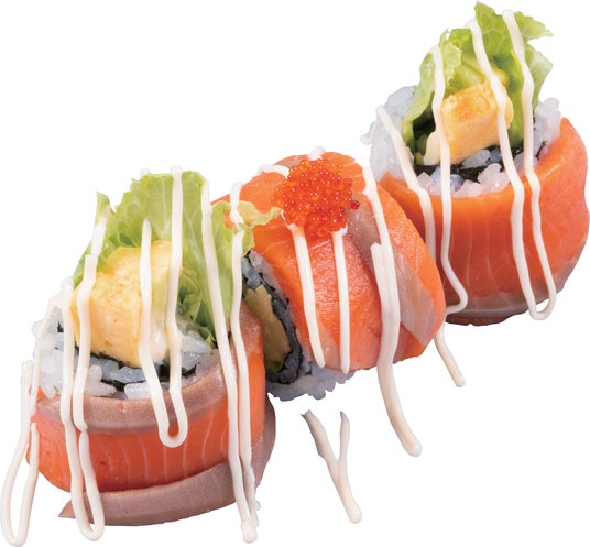 外側に人気ネタのひとつであるサーモンをのせ、アボカドダイス、玉子、レタスを巻き込んだ色鮮やかな「ドラゴンロール」に仕上げました。