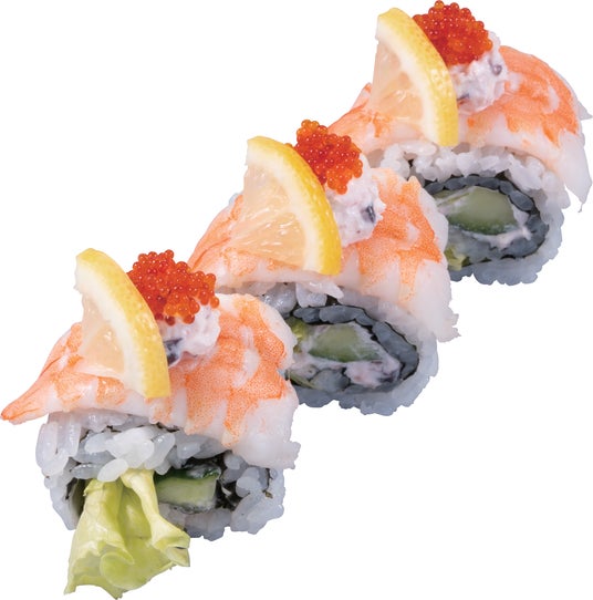 レタス、きゅうり、イカサラダを巻き込み、ボイル海老を外側にのせた裏巻き寿司(ロール寿司)を3等分にして、イカサラダを“追いトッピング”しました。とびことレモンをトッピングし、ぷちぷちした食感と爽やかな酸味、海老の旨みも楽しんでいただける一品です。