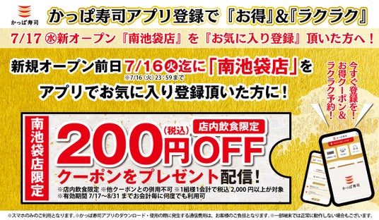 公式アプリ(https://www.kappasushi.jp/app.html) をダウンロード&会員登録いただき、7月16日(火)までに『南池袋店』をお気に入り登録いただくと7月17日(水)オープン日から8月31日(日)まで、お会計毎に何度でもご利用いただける“店内飲食限定200円(税込)OFFクーポン”をプレゼント配信いたします。