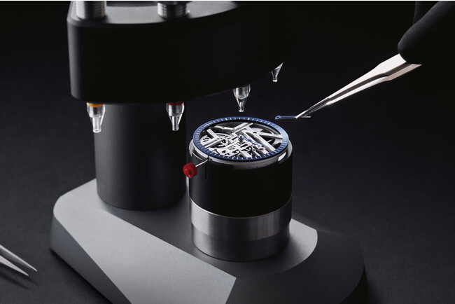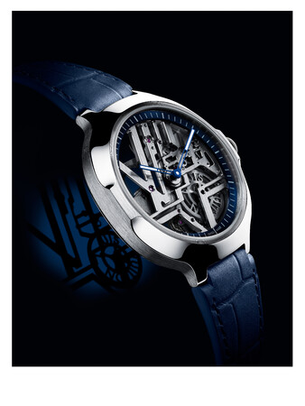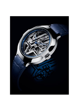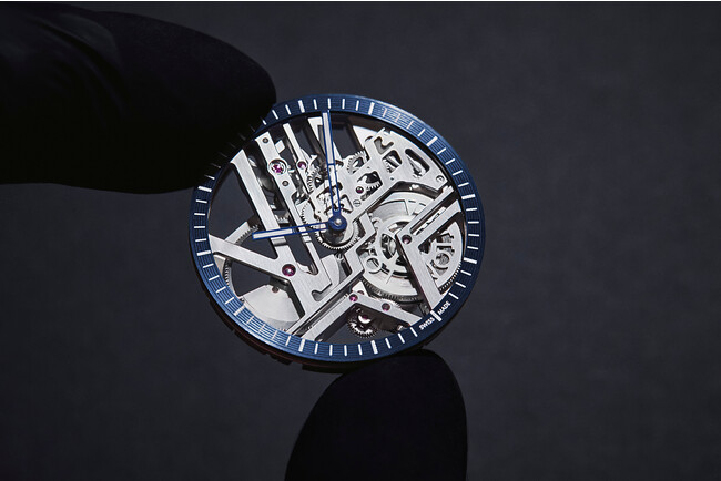 こうしたディテールへの入念な配慮によって、ウォッチフェイスは、ロジウムメッキが施されたムーブメントの部品が醸し出すモノクロームに近い美意識と完璧にマッチしたものに。機械式の部品を縁取るディープブルーのリングには分を表すインデックスが刻まれ、ブルーの時針と分針で最高の視認性が確保されています。