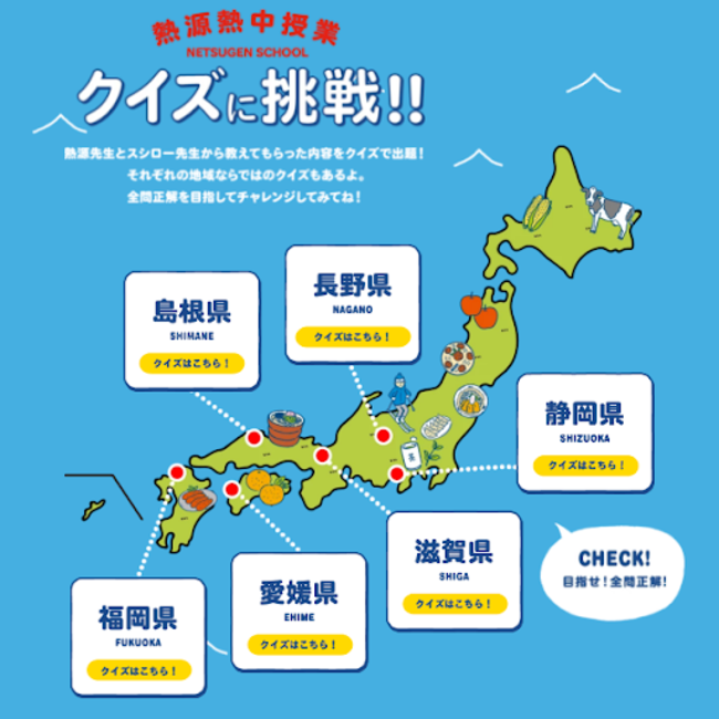 「海の特別授業」は長野県、福岡県、静岡県、島根県、愛媛県、滋賀県で開催し、各地の熱源と回転すしチェーンのスシローから講師役を招き、お寿司を通して魚や海の現状と未来について学びました。公式サイトでは各県ごとにオリジナルのクイズを5問ずつ、選択問題で出題しています。全問正解を目指して挑戦してみてください!