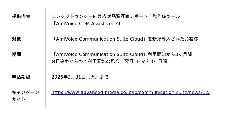 本キャンペーンは、「AmiVoice CQM Assist」とシームレスに連携可能なコンタクトセンター向けAI音声認識ソリューション「AmiVoice Communication Suite Cloud」を、新規導入されたお客様が対象です。