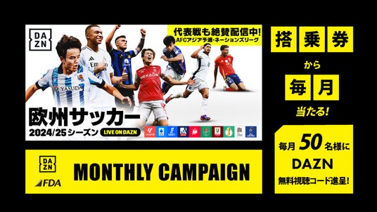 株式会社フジドリームエアラインズ(略称:FDA、本社:静岡県静岡市、代表取締役社長:楠瀬 俊一)はスポーツチャンネル「DAZN」とのコラボ企画として、FDA便にご搭乗されたFDAメンバーズの方を対象に『DAZNマンスリーキャンペーン』を実施いたします。