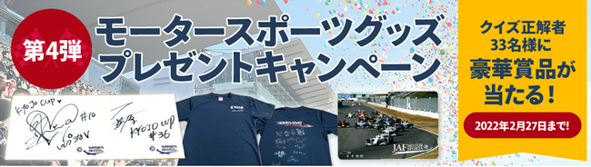 JAF(一般社団法人日本自動車連盟 会長 藤井一裕)は、1月24日(月)から2月27日(日)まで、第4弾となるモータースポーツグッズプレゼントキャンペーンを実施いたします。
