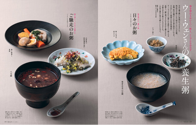 今年も寒さ厳しい季節がやってきました。体が冷えて乾くとき、味方にしたいのがお粥。お椀一杯のお粥がじんわり体を温めてくれます。そのおいしさと奥深さを知る料理家のウー・ウェンさんに、健やかな体作りの一助となるお粥と、一緒に食べると心もおなかも満たされる手軽なおかずを教えていただきました。この冬の養生に役立つ頼もしいレシピです。